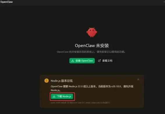 左侧最下方这个就是小龙虾了,点击就可以安装了。而且里面也有教程,很简单的,因为阁主已经安装过了,找了一张没安装的图片,如果你的电脑没有环境,会有提示,大家按照提示安装就可以了。